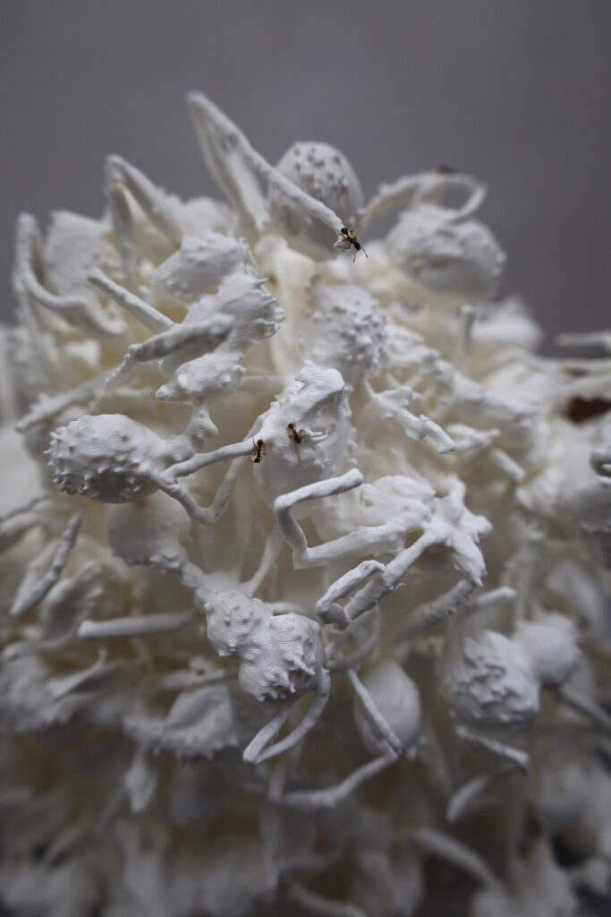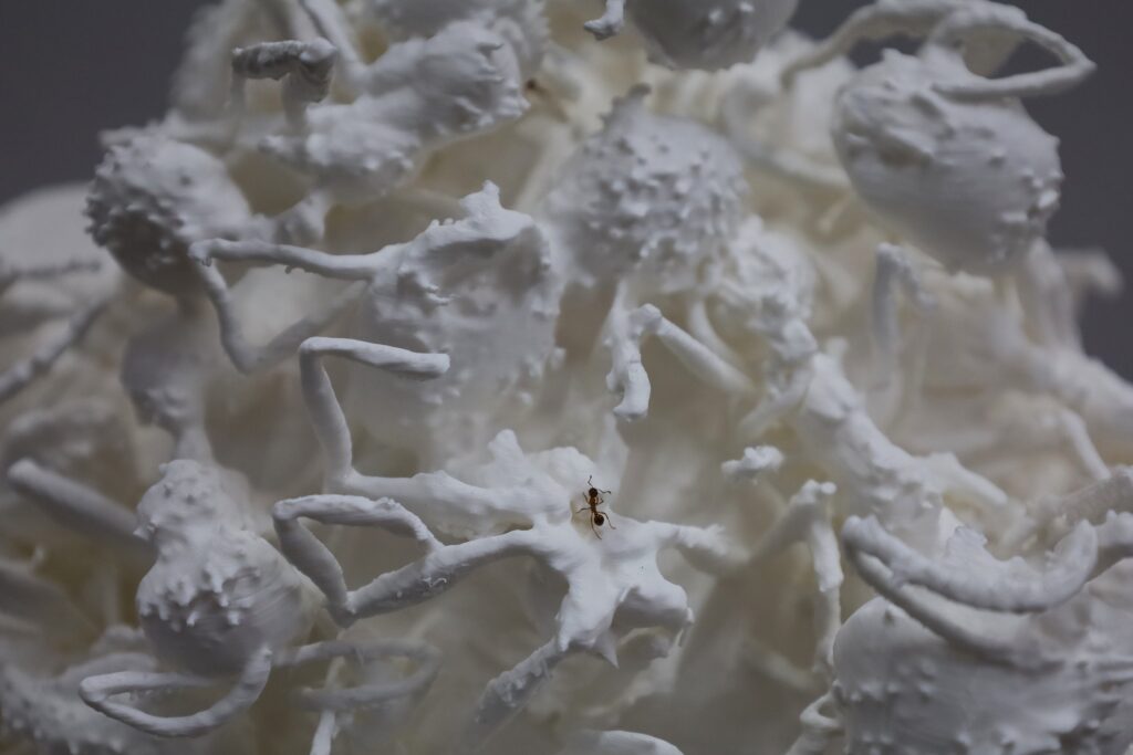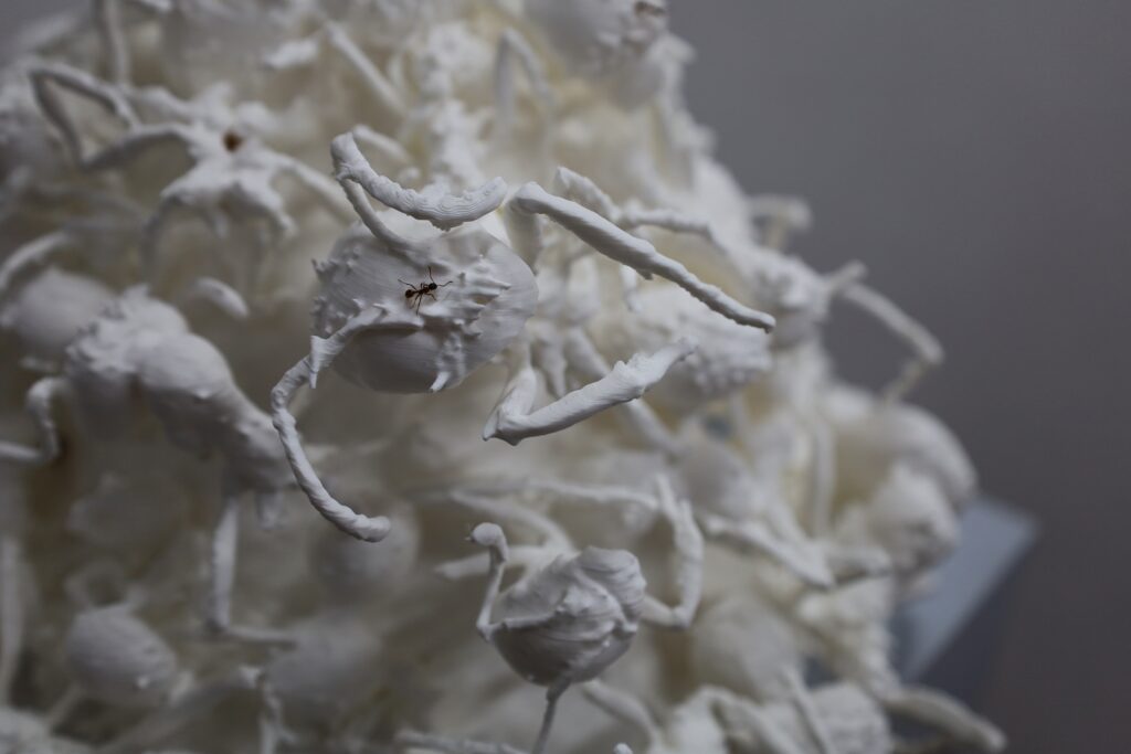 „Curiosity Killed the Colony“ zeigt eine 3D-Vergrößerung eines Micro-CT-Scans der Überreste einer Ameisenkolonie. Aus dem Wirrwarr der Körper entsteht ein künstlicher „Ameisenhaufen“ als Habitat für eine neue Kolonie. Die Arbeit ist ein Nachdenken über die menschliche Neugier als Eingriff in die Natur, das Beobachten, Vermessen und Rekonstruieren, sowie das Verhältnis von Erkenntnis, Kontrolle und Schaden.